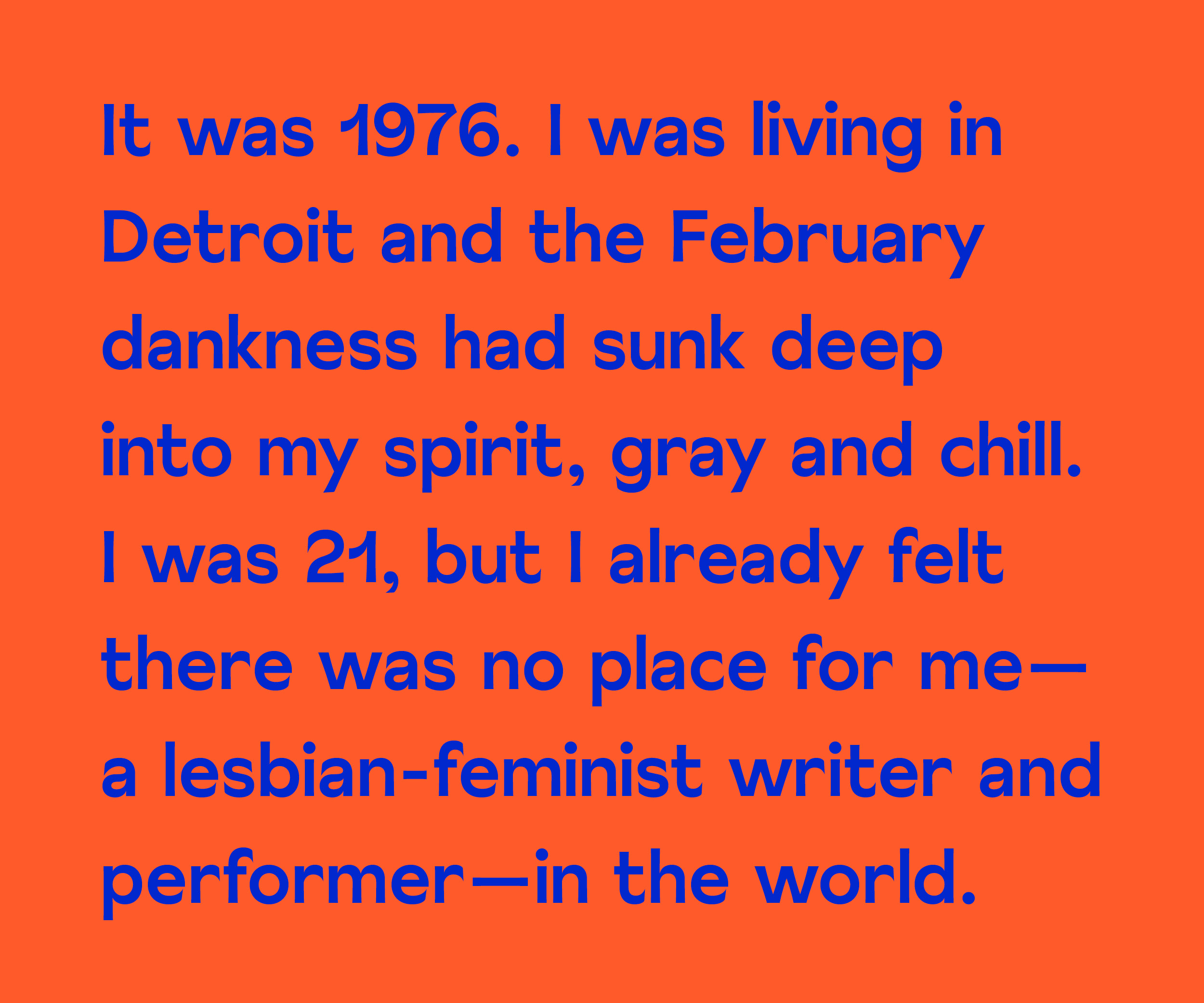 It was 1976. I was living in Detroit and the February dankness had sunk deep into my spirit, gray and chill. I was 21, but I already felt there was no place for me—a lesbian-feminist writer and performer—in the world. My friend, Mary, weary of my despair, pushed a strip of paper toward me across the coffee shop table. Mary was waitressing in a Chinese restaurant, and she’d lettered the strip to look like a fortune cookie. In her neat handwriting, I read: The will feeds on enormous vistas. Deprived on them, it collapses.¹ It would be Mary who would find me when, a few months later, I swallowed a bottle of sedatives, unable to see, in the flat Midwestern landscape, that vast panorama, a vision for how to fulfill my destiny.